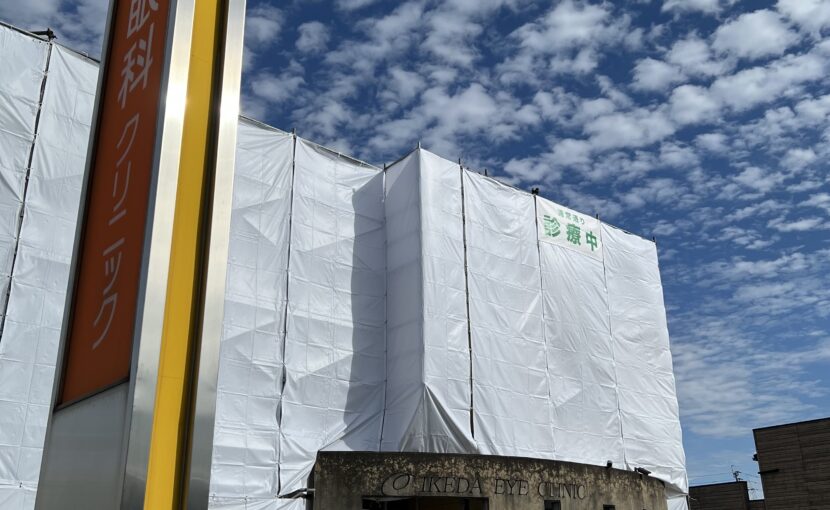 外壁の改修工事が始まりました 2025.10.19 外壁の老朽化に伴い、土曜日から改修工事が始まりました。 年内いっぱいかかる予定です。 工事期間中は建物周囲に足場が組まれネットが張られておりますが 駐車場は使用可能で通常通りに診療も行っております。 期間中、ご迷惑おかけいたしますがよろしくお願いいたします。